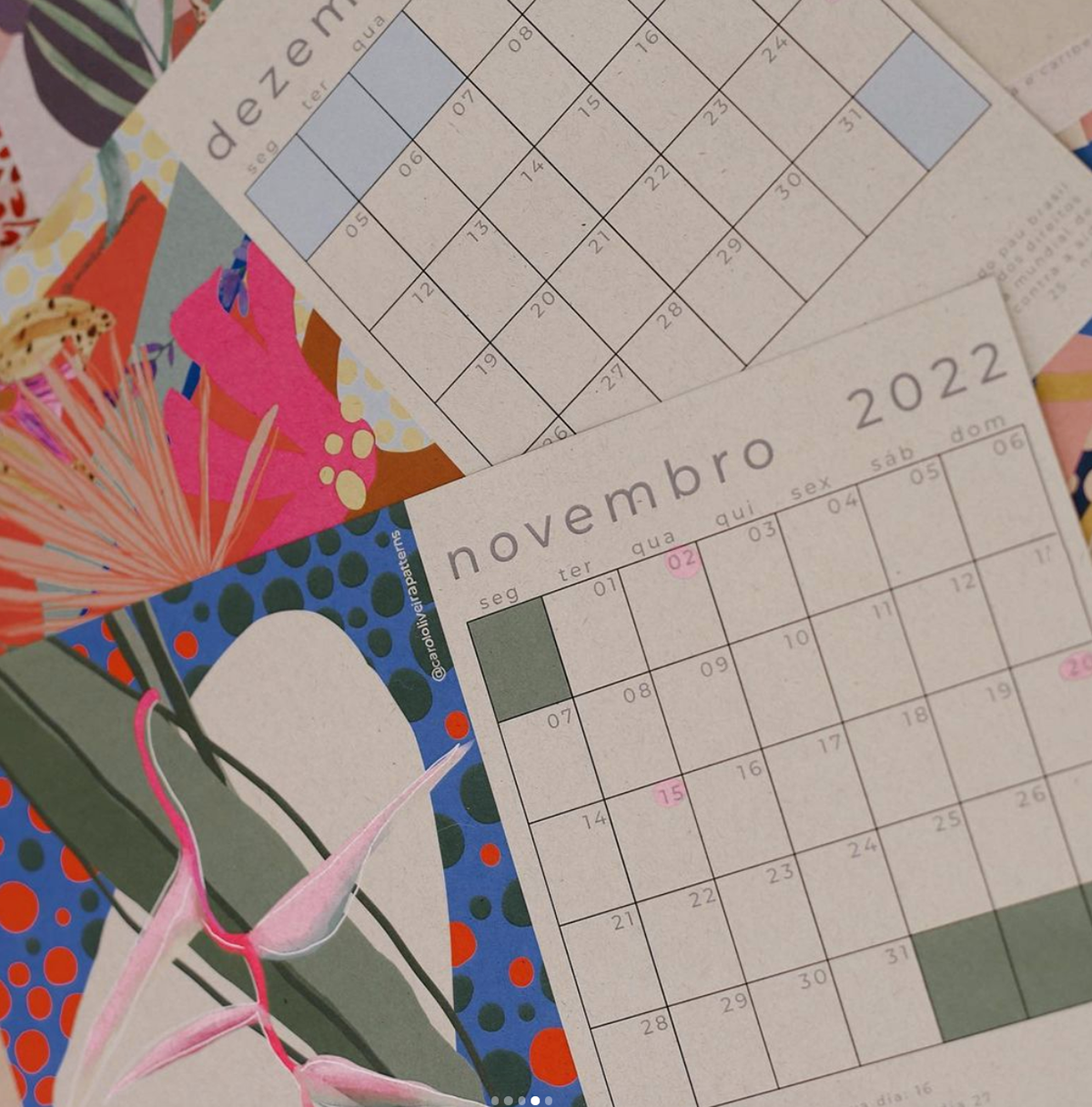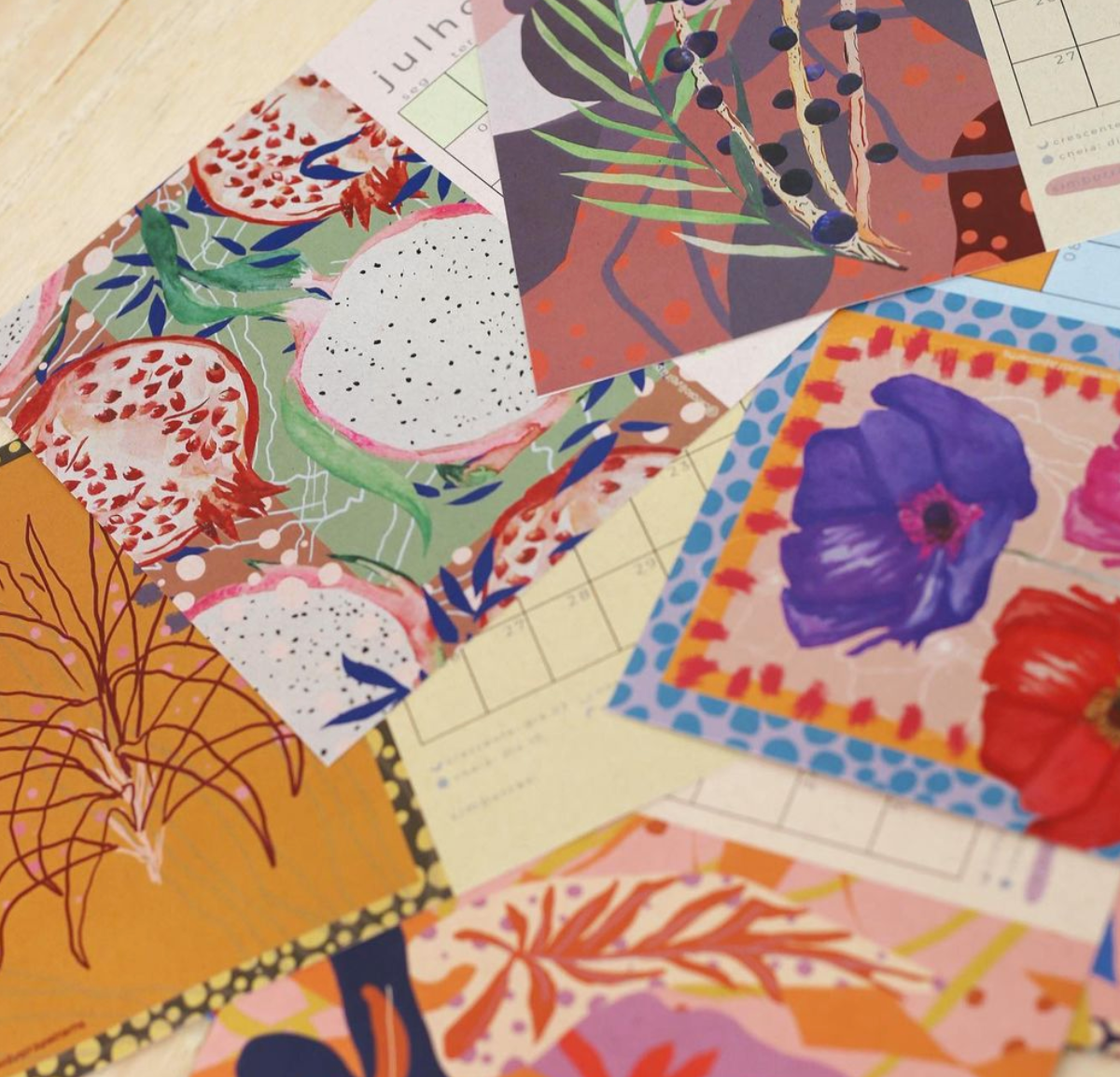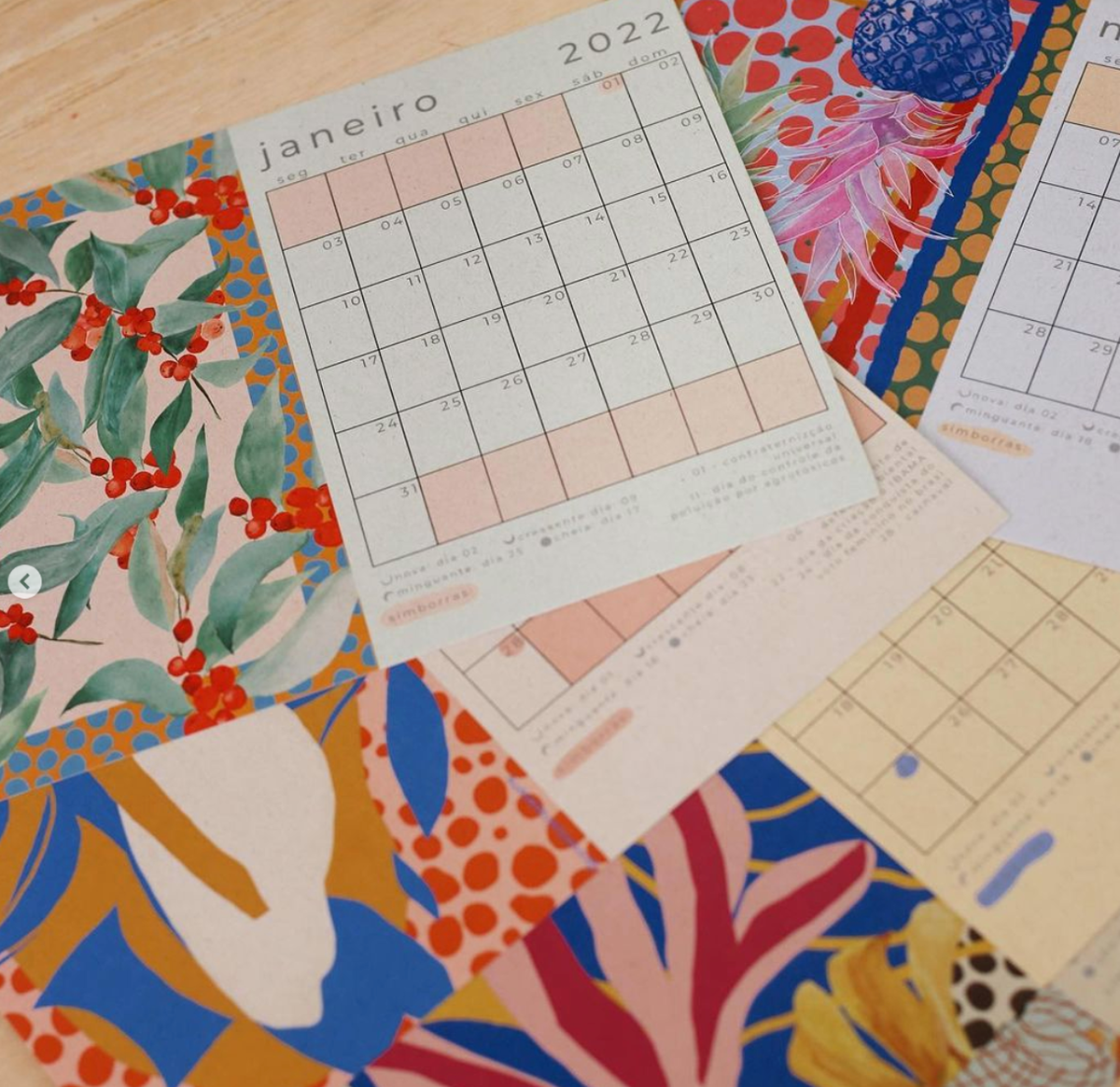 Calendário 2022 de estampas florais veio com mais 2 prints, com as épocas das frutas e com estampas para os meses em aquarela.
